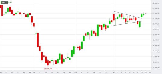 Wczorajsza sesja na Wall Street nie przyniosła większych zmian na wykresach jankeskich indeksów. DJIA utrzymuje się powyżej 27k zaś S&P500 oscyluje wokół poziomu 3000 punktów. Na wykresie indeksu szerokiego rynku wciąż straszy czerwcowo-lipcowa formacja klina, z której niedawno wybił się benchmark a tym samym wymierzył sobie cel na najbliższe dni czy też tygodnie. Mowa o poziomie 2912, na którym przebiega podstawa trójkątnej struktury a biorąc pod uwagę, że ostatnie średnioterminowe denko wypadło właśnie w strefie podstawy lutowo-kwietniowego klina, to i tym razem można oczekiwać od ursusów powtórki z rozrywki. Wczoraj S&P500 nie zdołał zanegować piątkowej świeczki mającej podażowy wydźwięk zatem dzisiaj rośnie prawdopodobieństwo ponowienia deprecjacji, co znów skutkowałoby pogorszeniem warunków do wzrostów na GPW. W poniedziałek WIG zmierzył się z lokalnymi maksimami jednakże po chwilowym wychyleniu się na nowe szczyty doszło do cofnięcia się benchmarku pod pułap 61000 punktów. Biorąc pod uwagę powstałe w ubiegłym tygodniu okno hossy można sądzić, że jakakolwiek próba wypchnięcia rynku na wyższe poziomy bez wcześniejszego domknięcia ww. luki okaże się zagraniem typu FAKE, dlatego też dla byków lepiej by było, aby przed dalszą podróżą na północ nabrać większego rozpędu. To oznaczałoby, że do wiarygodnego wybicia się z kilkutygodniowej konsolidacji brakuje tzw. cofki co jednak może zostać negatywnie odebrane przez zwolenników grania długich pozycji. Na wykresie FW20 widać podwójny szczyt zaś WIG20 układa się na kształt G&R, dlatego też sytuacja techniczna nieco się komplikuje zarówno dla ursusów jak i byków. Przełomu wciąż nie widać w drugiej linii GPW, gdzie mWIG40 stara się oddalić od MA200_d, jednakże jak na razie brakuje klarownych sygnałów kupna dla średniaków. Nieco lepiej prezentują się maluchy mianowicie wczoraj sWIG80 zamknął się na najwyższym od ponad dwóch miesięcy poziomie i jest na właściwej drodze do zaatakowania tegorocznych szczytów – o ile tylko nie pojawią się mocniejsze sygnały sprzedaży. Spokój widoczny jest na rynku walutowym i jeżeli EURPLN utrzyma dotychczasowy trend, to obawy związane z oG&R zostaną zanegowane a tym samym złoty otrzyma zielone światło do przetestowania 4.16PLN.