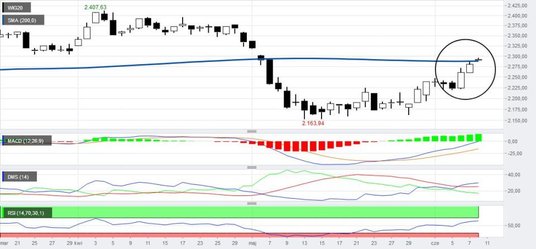 Ubiegły tydzień wypadł zdecydowanie korzystnie dla akcyjnych byków, którym udało się podnieść WIG20 do poziomów sprzed miesiąca, kiedy to indeks przebijał dzienną dwusetkę. Średnia ta zatrzymała w piątek dalszą zwyżkę i jeżeli czerwcowe podbicie ma się okazać czymś więcej niż tylko kolejną korektą wzrostową, to WIG20 powinien w najbliższych dniach uporać się z podażową strefą rozciągającą się pomiędzy 2283 a 2317.5 punktów. Granice te wyznaczone są min. przez 50% zniesienie ostatniej deprecjacji, MA200_d, EMA_w oraz formację weekly gap, która wciąż wywiera negatywny wpływ na Big Picture. Wprawdzie lokalnie sytuacja techniczna wyraźnie się poprawiła na korzyść akcjonariuszy, o tyle w średnim terminie wciąż obowiązują sygnały typu SELL. Ostrzeżeniem dla graczy znad Wisły może okazać się zeszłotygodniowa czkawka niemieckich byków w okolicy oporu zlokalizowanego na wysokości 12124.5. Pomiędzy środą a piątkiem trzykrotnie dochodziło do próby wbicia się ww. bechmarku nad dolne ograniczenie kanału wzrostowego i wybicie sufitu podażowej świeczki jaka ukształtowała się w ostatnich dniach maja. Z drugiej strony wraz z aprecjacją największych spółek notowanych na Książęca 4 pojawił się silny popyt na złotego. Cross USDPLN został przeceniony o prawie 2%, wskutek czego kilkumiesięczna linia wzrostowej konsolidacji została przerwana. Na uwagę zasługuje także najniższe zamknięcie się EURPLN od sierpnia 2018.r., kiedy to weekly close wypadło na wysokości 4.251. Udany tydzień także mają jankeskie indeksy giełdowe, którym udało się odkręcić większość podażowych sygnałów i są obecnie na właściwej drodze do zaatakowania tegorocznych oporów. Wsparciem na ten tydzień dla S&P500 jest 2728 i do tej wysokości indeks jest bezpieczny a tym samym rozgrywającym na akcyjnych parkietach są akcyjne byki.