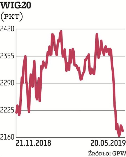 Przypomnijmy, że pierwsze tygodnie maja przyniosły gwałtowną zniżkę indeksu dużych spółek. W poprzednim tygodniu udało się ten spadek wyhamować. Można więc było liczyć na jakiekolwiek odbicie w poniedziałek, jednak tylko w pierwszych minutach handlu przeważał kolor zielony. WIG20 dość szybko zanurkował poniżej poziomu zamknięcia z piątku i w kolejnych godzinach pogłębiał zniżkę. Na godzinę przed końcem handlu indeks blue chips sięgnął 2160 pkt, czyli niewiele wyżej, niż wypadły zeszłotygodniowe minima. Część tej straty udało się odrobić podczas ostatniej godziny sesji, jednak ostatecznie i tak WIG20 zakończył dzień spadkiem o 0,4 proc., czyli w okolicach 2175 pkt. Z jednej strony możemy więc mówić o „uklepywaniu" dna powyżej poziomu 2160 pkt z szansą na odbicie. Jednak na pozytywny scenariusz w tej sytuacji powinny wskazywać rosnące obroty. W poniedziałek zaś ledwo przekroczyły 400 mln zł, z czego jedna czwarta przypadła na PKN Orlen i CD Projekt. Z poniedziałkowej sesji warto odnotować świetne zachowanie Dino Polska, które odrabiało czwartkowe straty, powstałe w efekcie nowych informacji na temat podatku handlowego. Akcje właściciela sieci sklepów Dino zwyżkowały pierwszego dnia tygodnia o 4,26 proc. Również Eurocash zdołał odrobić część zeszłotygodniowych zniżek. Nie udało się to CCC, które było jedną z najsłabszych firm w gronie blue chips.