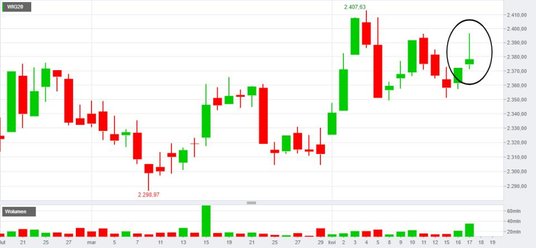 Nasz rynek korzystał w środę z dobrych danych tylko w pierwszej fazie sesji. WIG20 zaczął z przytupem i w pierwszych godzinach wzrósł do dziennego maksimum 2396 pkt. Okrągły opór 2400 pkt był na wyciągnięcie ręki, ale nie udało się pokonać tego krótkiego dystansu. Niewykorzystane sytuacje czasem się mszczą i niestety druga połowa sesji należała do niedźwiedzi. Indeks osuwał się trochę pod własnym ciężarem i oddał lwią część porannego dorobku. Słabe były CD Projekt oraz KGHM, których papiery potaniały o ponad 3 proc. Na drugim biegunie były CCC (+3 proc.) oraz Dino Polska (+2,12 proc.). Ostatecznie indeks dużych spółek zakończył środę symboliczną zwyżką o 0,26 proc., do 2378 pkt. Dzienna świeca ma niestety negatywną wymowę. Jest to tzw. spadająca gwiazda (mały korpus, długi górny cień), która może prowokować pogłębienie trwającej korekty. Wsparciem na czwartek jest 2350 pkt, a wspomniany poziom 2400 pkt pozostaje oporem.
