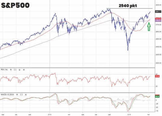 Okazuje się jednak, że wybicie nowego maksimum może nieco odwlec się w czasie. Wskazuje na to bowiem analiza wykresu i bardzo skuteczny sygnał, który się w ostatnich dniach pojawił. – Zwolennicy grania długich pozycji na razie nie przejmują się formacją klina oraz niedomkniętą, tygodniową luką hossy z początku miesiąca. Na przestrzeni ostatnich 30 lat pojawiło się jedynie 19 takich luk, co pokazuje, jak nietypowa sytuacja miała ostatnio miejsce. Za każdym razem, kiedy na wykresie pojawiała się przestrzeń punktowa pomiędzy dwoma średnioterminowymi świeczkami, indeks S&P 500 korygował się później do niedomkniętej luki. Posiłkując się badaniami za ostatnie trzy dekady, należałoby zatem postawić tezę, że benchmark szerokiego rynku z prawdopodobieństwem bliskim 100 proc. powinien w niedalekiej przyszłości wykonać krok w tył do wysokości 2848,63 pkt – tłumaczy z niemal chirurgiczną precyzją Piotr Neidek, analityk techniczny DM mBanku. Jego zdaniem taka korekta jest tylko kwestią czasu, choć w ujęciu krótkoterminowym na razie nie widać na wykresie sygnałów sprzedaży. Ruch powrotny może więc zostać wykonany jeszcze przed atakiem na szczyt lub po nim. Biorąc jednak pod uwagę skalę trwającej od grudnia fali wzrostowej, takie schłodzenie rynku będzie wręcz wskazane, jeśli przed nami jeszcze rok hossy.