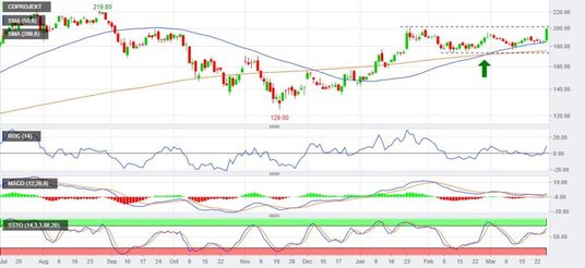 Tuż po 13.00 WIG20 spadał o 0,2 proc. do 2321 pkt. Indeks blue chips nie wyróżniał się pod tym względem na giełdowej mapie Starego Kontynentu. W tym samym czasie bowiem CAC40 tracił 0,1 proc., DAX 0,2 proc., a BUX nawet 0,6 proc. Z technicznego punktu widzenia najważniejsze jest to, że indeks trzyma się w bezpiecznej odległości od lokalnego dołka 2286 pkt. Warto dodać, że liderem zwyżek w portfelu WIG20 był CD Projekt. Jego akcje drożały o 5,6 proc. do 196,1 zł. Zwyżka była reakcją na opublikowany dziś raport wynikowy. W IV kwartale 2018 r. spółka wypracowała przychody i zysk netto na poziomie odpowiednio 127,3 mln zł oraz 41,4 mln zł. W obu przypadkach przebite zostały oczekiwania analityków. Poniżej ich prognoz – o 16,5 proc. – wypadł zysk operacyjny (32,8 mln zł). Dzisiejsza zwyżka kursu akcji CD Projektu przybliża go do przebicia oporu 200 zł. Jeśli się to uda, drogą na historyczny szczyt 222 zł będzie otwarta.