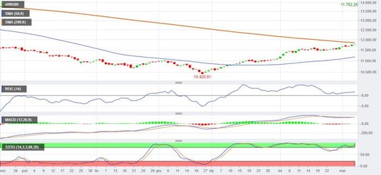 Indeks mWIG40 oscylował przy poziomie wczorajszego zamknięcia, a sWIG80 rósł o 0,1 proc. do 11 769 pkt. Przy tym ostatnim warto się na chwilę zatrzymać, bo choć zyskuje niewiele to wyznacza nowy szczyt trwającego od kilku miesięcy trendu i jest najwyżej od września ubiegłego roku. Coraz bliżej jest średnia krocząca z 200 sesji (obecnie przy 11 840 pkt). Jej pokonanie byłoby oznaką trwalszego przesilenia i sygnalizowałoby przynajmniej średnioterminowe umocnienie w segmencie maluchów.