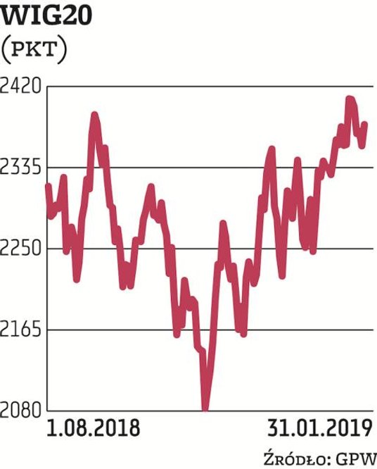 Rozpoczęliśmy z wysokiego C. WIG20 już na starcie zyskał 1 proc. Optymizm widoczny był także na innych rynkach. Wydawało się więc, że droga do tego, aby atakować wyższe poziomy, stoi otworem. Niestety, na tym obrazie zaczęły się pojawiać rysy. Po początkowym optymizmie w kolejnych godzinach handlu dało się zauważyć zawahanie inwestorów. Było ono szczególnie dobrze widoczne na największych europejskich parkietach, gdzie główne indeksy wróciły w okolice zamknięcia ze środy. WIG20 w połowie dnia zyskiwał 0,6 proc., jednak dalszy przebieg notowań i tak pozostawał sprawą otwartą. Los europejskich rynków leżał w rękach Amerykanów. Ci, jak się okazało, po środowych mocnych zwyżkach wcale nie zamierzali spuszczać z tonu. Już po godzinie od rozpoczęcia handlu na Wall Street indeks S&P 500 zyskiwał ponad 0,5 proc. Sprzyjające otoczenie zostało skrzętnie wykorzystane przez byki na GPW. Końcowy fragment sesji w Warszawie to powrót do mocnego wzrostu. Ostatecznie WIG20 zyskał prawie 1 proc. i po czwartkowej sesji do okrągłego poziomu 2400 pkt brakuje mu już tylko 20 pkt. mWIG40 zyskał 0,9 proc., natomiast sWIG80 urósł 0,2 proc. Warto zwrócić uwagę, że czwartkowa sesja była jednocześnie ostatnią sesją miesiąca. Bilans stycznia na warszawskim parkiecie jest naprawdę zadowalający. WIG20 zyskał w tym czasie prawie 4 proc. Aż chce się po- wiedzieć: oby tak dalej! ¶