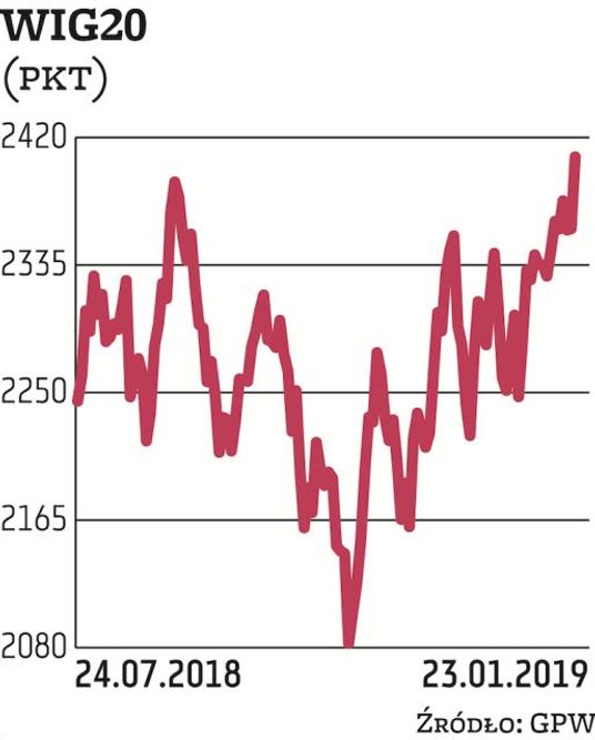 Środową sesję WIG20 zakończył zwyżką o 2 proc. do 2407 pkt, co było najlepszym wynikiem na giełdowej mapie Starego Kontynentu. Trudno wskazać konkretną przyczynę tej siły. Analitycy mówili o pozytywnym wpływie braku postępów w kwestii brexitu. Pytanie tylko – dlaczego argument ten miałby działać na rynek warszawski, a nie działał na inne rynki, gdzie skala zniżek była znacznie mniejsza. Wygląda na to, że rynek po prostu idzie za ciosem i kontynuuje noworoczny rajd. W środę wyraźne napędzał go CD Projekt, którego papiery drożały o ponad 10 proc., nawet do 198,4 zł. Jak podała agencja Bloomberg, Morgan Stanley rozpoczął wydawanie rekomendacji dla producenta „Wiedźmina" od zalecenia „przeważaj". Ponadto pięć spółek osiągnęło co najmniej roczne maksimum notowań, m.in. PEP, PGNiG, Sonel, a 10 analogiczne minimum, m.in. EUCO, Mabion, Skarbiec TFI. Warto dodać, że wartość obrotów przekroczyła 1 mld zł. ¶