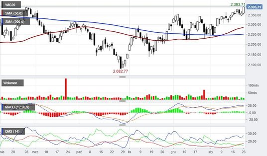 Nasz wskaźnik blue chips jest na ten moment najsilniejszym indeksem na giełdowej mapie Starego Kontynentu. Dla porównania – DAX i CAC40 zyskują po ok. 0,3 proc. Gwiazdą parkietu jest CD Projekt, które akcje zyskują 10 proc. i wyceniane są na 192 zł. - Byki w wielkim stylu wyprowadzają dziś wybicie w górę, dla którego paliwem stało się rozpoczęcie wydawania rekomendacji dla spółki od zalecenia "przeważaj" i ceną docelową na poziomie 240 zł przez Morgan Stanley – pisał na portalu stooq.pl Jacek Rzeźniczak. W portfelu dużych spółek słabością raziła tylko spółka CCC, której papiery tanieją o 2,3 proc. Warto zwrócić uwagę na sytuację techniczną WIG20. Wyjście na 2395 pkt oznacza nowy szczyt trwającej od dwóch miesięcy tendencji wzrostowej. Cel na dziś, czyli 2380 pkt został wykonany. Teraz czas na 2400 pkt. Wsparciem na najbliższe dni pozostaje 2350 pkt.
