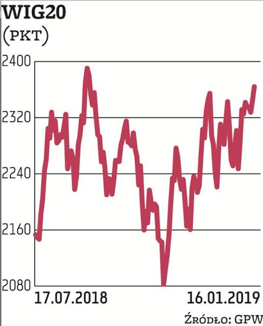 Indeksy amerykańskie wystartowały o 15.30 w zielonych barwach, co pchnęło w górę i nasz rynek. WIG20 ruszył w kierunku sesyjnych maksimów, osiągając jeszcze przed fixingiem poziom 2361 pkt. – Rynkom sprzyja karuzela wynikowa za oceanem, która na razie na przykładzie banków pokazuje, że wyniki w ostatnim kwartale 2018 r. wciąż były przyzwoite – tłumaczył Piotr Jaromin, analityk XTB. Miał na myśli m.in. wyniki Bank of America i Goldman Sachs, które były lepsze od oczekiwań analityków. Środową sesję warszawski rynek kończył więc w bardzo dobrych nastrojach. Najlepiej widoczne to było w segmencie średnich spółek, bowiem mWIG40 rósł w porywach do 4087 pkt, co jest najwyższym poziomem od początku października 2018 r. Wskaźnik sWIG80 pozostaje relatywnie słabszy, ale ważne jest to, że utrzymuje się powyżej średniej z 50 sesji, co stanowi wstępny sygnał przesilenia. WIG20 natomiast zakończył dzień zwyżką o 0,8 proc., do 2364 pkt, a więc jest o włos od wyjścia na nowe maksima trwającej od października tendencji wzrostowej. W jego portfelu najlepiej radziła sobie PGNiG, a najgorzej JSW. Na szerokim rynku najmocniejsze były Vivid Games i Sunex, których papiery drożały nawet o ponad 20 proc. Słabością raził Solar, tracący 8 proc. Warto dodać, że na co najmniej rocznym maksimum znalazło się pięć spółek (InterSport, Lotos, PGNiG, Starhedge, Sunex), a na analogicznym minimum trzy (ABM Solid, Kompap, Pozbud). Wartość obrotów jeszcze przed fixingiem przekroczyła 750 mln zł. ¶
