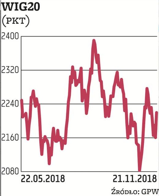 Już po kilkunastu minutach WIG20 rósł o 0,7 proc., a jeszcze przed południem udało się wznieść powyżej okrągłego poziomu 2200 pkt i go utrzymać. WIG20 dotarł nawet 20 pkt wyżej. Dzień zakończył się tuż przy najwyższych pułapach piątkowej sesji, która przyniosła spadek o 1,7 proc. Można uznać, że na wykresie powstał tym samym byczy sygnał. Podczas trzech poprzednich dni kupującym udawało się obronić poziom 2150 pkt – widać, że jest to bardzo mocna bariera. Co ważne, dzięki zakończeniu sesji na dziennych maksimach udało się wybić powyżej linii spadkowej, poprowadzonej po maksimach z 8 i 15 listopada. Wygląda więc na to, że w kolejnych dniach byki zechcą zmierzyć się z 2250 pkt. W tym miejscu okaże się, czy w grę wchodzi walka z listopadowym szczytem, czy jednak mieliśmy do czynienia jedynie z korektą ostatnich spadków. Scenariusz pierwszy zakładałby powtórkę z przełomu października i listopada. WIG20 był liderem europejskich indeksów, choć na większości rynków przeważał kolor zielony.