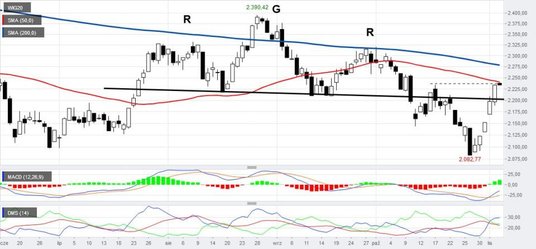 W poniedziałek WIG20 rósł już piątą sesję z rzędu. W tym czasie zyskał blisko 200 pkt i wniósł nieco więcej optymizmu w sytuację techniczną. Po pierwsze bowiem wrócił nad 2200 pkt, gdzie przebiega linia szyi formacji głowy z ramionami. Po drugie wczoraj zaatakował lokalny szczyt z października 2234 pkt, co daje szanse na przełamanie niekorzystnej sekwencji coraz niżej położonych maksimów. Warto dodać, że w tej okolicy przebiega 50-sesyjna średnia, a więc mamy tutaj kumulację silnych oporów, które będą w najbliższych dniach sporym wyzwaniem dla obozu byków. Po trzecie w końcu - MACD zakręcił w górę i zbliża się do linii 0. Jeśli przebije tę ostatnią, to wzmocni pozytywną wymowę ostatnich zwyżek. Dzisiejszą sesję WIG20 zaczął od cofnięcia. Po 15 minutach handlu spadał o 0,3 proc. do 2225 pkt. Kontra niedźwiedzi po tak silnych zwyżka jest całkiem naturalna. Jak sytuację oceniają maklerzy?