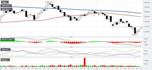 Wtorkowa sesja na wykresie WIG20 rozpoczęła się neutralnie. Przez kolejne godziny handel oscylował w okolicy 2105 punktów. Do poprawy nastrojów doszło w godzinach popołudniowych, kiedy do sesji przyłączyli się inwestorzy zza oceanu. Kurs WIG20 pokonał poniedziałkowe szczyty i zamknął się na wysokości 2122. Podobnie jak w poniedziałek, znacznie słabiej radziły sobie spółki średnie, których indeks stracił na wartości -0,18% i dotarł do najniższych poziomów od sierpnia 2016 roku. Na wykresie bezsprzecznie widać dominację sprzedających. Trend spadkowy przybiera na sile i jak na razie nie widać sygnałów świadczących o jego rychłym zakończeniu. Pozytywna dywergencja pomiędzy ceną a RSI informuje o chwilowym wyprzedaniu, jednak bez potwierdzenia poprzez wzrostowe podejście, ciężko jest na tej podstawie budować korzystne scenariusze. Na rynkach zagranicznych przewagę posiadają kupujący, co prawda od strony technicznej jeszcze nie doszło do przełomu i wygenerowania sygnałów kupna, jednak wzrosty w USA o +1,5% oraz blisko 2% aprecjacja w Japonii powinny korzystnie nastrajać inwestorów przy Książęcej 4.