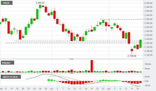 Indeks rósł od samego rana, pomimo dwóch niesprzyjających faktów. Po pierwsze – Włosi uchwalili budżet na 2019 r. powiększając deficyt budżetowy do 2,4 proc., a więc nie zrezygnowali z rozrzutności pomimo ostrzeżeń Brukseli. Po drugie – poznaliśmy niezbyt korzystne dane z polskiego rynku pracy. Okazało się, że we wrześniu przeciętne wynagrodzenie w sektorze przedsiębiorstw zwiększyło się o 6,7 proc. r/r wobec konsensusu rynkowego na poziomie 7,1 proc. r/r, natomiast przeciętne zatrudnienie zwiększyło się o 3,2 proc. r/r, a więc też poniżej oczekiwanych 3,4 proc. r/r. Inwestorzy zignorowali te informacje i zdołali podnieść WIG20 o 2,15 proc. do 2216 pkt. Pułap 2200 pkt, czyli lokalny opór i linia szyi zbudowanej w ostatnich miesiącach formacji głowy z ramionami, został naruszony przez długą białą świece z białym korpusem. O ile w hossie ignorowanie złych informacji jest całkiem normalne, to w obecnej sytuacji raczej należy mówić o zwykłej korekcie, spowodowanej lokalny wyprzedaniem. Tąpnięcie z ubiegłego tygodnia musiało spotkać się kontrą, co zresztą nie dotyczy tylko Warszawy, ale także innych rynków. Wall Street zaczęła wtorkową sesję od wzrostu S&P500 o 1 proc., co tylko zachęciło nasz rynek do podniesienia wycen w ostatniej fazie sesji. Tuż przed zamknięciem najmocniej w portfelu blue chips zyskiwały CCC i CD Projekt, a na lekkim minusie były tylko KGHM i LPP. Na chwilowej poprawie nastrojów skorzystały też średnie spółki. Indeks mWIG40 przełamał bowiem okrągły poziom 4000 pkt. Maluchy natomiast, w swoim „tegorocznym" stylu, zanotowały spadek i sWIG80 utrzymuje się w bliskiej odległości od aktualnego dołka bessy.