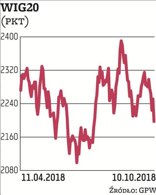 Już po 30 minutach zaczął spadać i taki kierunek utrzymał do końca sesji. Z samego rana nie pomagało mu to, że S&P500 nie zdołał we wtorek wrócić nad 2900 pkt. Ponadto inwestorzy cały czas obawiają się o konflikt na linii Włochy–Bruksela. W środę rano usłyszeliśmy od wicepremiera Salviniego, że rząd może zachęcać obywateli do kupna obligacji. – Wygląda na to, że do końca sporu jest jeszcze daleka droga – skomentował to krótko Konrad Białas, główny ekonomista TMS Brokers. W końcówce sesji WIG20 dostał jeszcze obuchem zza oceanu. Indeksy S&P500 i Nasdaq rozpoczęły handel od spadków i po niecałych dwóch godzinach traciły odpowiednio 1 proc. i 1,5 proc. Korekta na Wall Street się pogłębia, co sugeruje, że dotychczasowa bezpieczna przystań też zaczyna szwankować. Oczywiście skala wyprzedaży za oceanem jest wciąż niewielka, ale wystarczy, by popsuć i tak już zepsute nastroje w Europie. Efekt końcowy był taki, że WIG20 spadł w środę o 2,4 proc., do 2197 pkt. Tak nisko jego notowania nie były od końca lipca. Indeks przełamał lokalne wsparcie 2210 pkt, co oznacza techniczne zaproszenie do pogłębienia przeceny nawet w rejon 2150 pkt. Oporem pozostaje lokalny szczyt przy 2320 pkt. Warto dodać, że największym ciężarem w portfelu blue chips były: jego największy udziałowiec PKO BP i do niedawna jego najsilniejsza gwiazda CD Projekt. Na plusie pod koniec sesji trzymały się tylko JSW i Alior Bank. Wśród giełdowych „misiów" też dominowała czerwień. Obroty przekroczyły 600 mln zł. ¶
