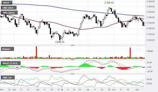 Szkoda tylko, że w ślad blue chips nie poszły „misie". Indeksy średnich i małych spółek kontynuowały we wtorek spadkowe tendencje. Wskaźnik mWIG40 zanotował czwartą spadkową sesję z rzędu (spadł o 0,9 proc., do 4025 pkt), a sWIG80, choć wzrósł, pogłębił dołek bessy do 11 336 pkt. Na szerokim rynku 41 proc. spółek kończyło dzień na minusie, a 36 proc. na plusie. Co najmniej roczne maksimum notowań wyznaczyły cztery spółki (Berling, CNT, IMCompany i Projprzem), a analogiczne minimum aż 15 (m.in. Braster, Play i Ursus). Wartość obrotów nie była we wtorek zawrotna i wyniosła 706 mln zł. Ponad jedną trzecią tej kwoty wypracowały tylko trzy spółki: PKN Orlen, PZU i CD Projekt. Ta ostatnia jest w kiepskiej kondycji (w poniedziałek papiery potaniały 10,5 proc.). Od szczytu z końca sierpnia papiery potaniały bowiem o 26 proc., co z technicznego punktu widzenia oznacza, że na wykresie kursu akcji producenta „Wiedźmina" panuje już bessa.