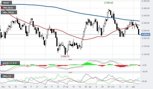 Poniedziałek rozpoczynaliśmy od wyprzedaży w Chinach, gdzie przez ubiegły tydzień rynki były zamknięte. Potem nie było lepiej. W Europie w centrum uwagi są Włochy i ich propozycja 2,4% PKB deficytu budżetowego w '19 (KE oczek. 1,6%). Obserwujemy wyraźny wzrost rentowności tamtejszych obligacji (w miesiąc 10-latki z 2,8% na 3,6% przy polskich 3,3%) i spadek notowań na giełdzie w Mediolanie. Dodatkowo dochodzi globalna wyprzedaż producentów gier, gdzie u nas CD Projekt to 8 spółka pod względem wagi w WIG20 (wczoraj -11%, YTD +49%). Tym samym gł. indeks schodzi w okolice niedawnych minimów (2224 pkt) zlokalizowanych w okolicy 2210 pkt. Dolar w tym czasie jest relatywnie spokojny, choć jego umocnienie z końcówki września jest zauważalne. W rezultacie notowania MSCI EM spadają poniżej ostatnich dołków (