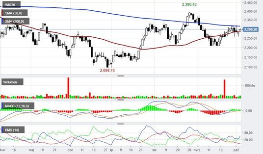Doniesienia włoskiej prasy o możliwości ograniczenia deficytu budżetowego w perspektywie trzech lat przyniosły rynkom lekką ulgę. Na warszawskim parkiecie, podobnie jak na zagranicznych, dominował w środę kolor zielony. WIG20 był liderem zwyżek. Zyskał bowiem 0,8 proc. i zakończył dzień na poziomie 2298 pkt. Opór 2300 pkt. jest więc o włos, podobnie jak coraz bliżej jest do utworzenia przez średnie kroczące z 50 i 200 sesji formacji złotego krzyża. Do siły WIG20 zdążyliśmy się już przyzwyczaić. Trzeci kwartał zakończył bowiem 7-proc. zwyżką notowań, podczas gdy mWIG40 i sWIG80, straciły odpowiednio 1,2 proc. oraz 9,5 proc. Te dwa ostatnie indeksy radziły sobie w środę mizernie. Zyskały po 0,3 proc. i w pozostają w długoterminowych układach bessy.