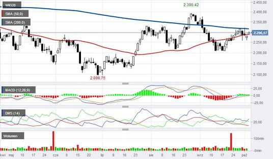 Środowa sesja na GPW zaczęła się od zwyżek głównych indeksów. WIG20 rósł o 0,7 proc. do 2296 pkt, mWIG40 o 0,36 proc. do 4166 pkt, a sWIG80 o 0,36 proc. do 11 495 pkt. Zielone otwarcie do pokłosie dobrych wieści z Włoch. - Wydarzeniem ostatnich godzin na rynkach finansowych były doniesienia włoskiej gazety „Corriere" wskazujące, iż tamtejszy rząd ma w planach ograniczenie deficytu do sugerowanego poziomu 2 proc. do 2021r. Po dwóch dniach agresywnej retoryki jest to sygnał poprawiający nieco nastroje na rynkach - pisałem w porannym komentarzu Konrad Ryczko, analityk DM BOŚ. Gdyby ten przypływ optymizmu podniósł WIG20 do powyżej 2300 pkt, to mógłby to być moment przełomowy z punktu widzenia analizy technicznej. Indeks jest bowiem zamknięty między średnimi kroczącym z 50 i 200 sesji. Wyjście ponad tą drugą połączone z utworzeniem formacji złotego krzyża (obie średnie dzieli zaledwie 25 pkt) byłoby pozytywnym sygnałem. Czego spodziewają się analitycy?