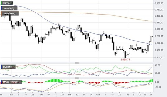 Trzeba przyznać ponadto, że odpoczynek trochę się GPW należy. Przypominam bowiem, że w ciągu ostatnich trzech sesji WIG20 zyskał prawie 4,6 proc. Dzięki temu udało mu się opuścić krótkoterminową konsolidację (2200-2130 pkt) i sforsować 50-sesyjną średnią kroczącą. Zwróciłbym uwagę na jeszcze dwa pozytywne sygnały techniczne. Pierwszy – linia +DI wrócił nad –DI, a ADX zaczął rosnąć. To potwierdza rosnącą przewagę byków. Drugi – MACD jest bliski przebicia poziomu 0, czego nie udało mu się zrobić od lutego tego roku. Oczywiście na ten moment są to tylko wstępne sygnały. Testem dla byków będzie lokalny szczyt z czerwca, czyli poziom 2287 pkt. Jego przebicie będzie oznaczać przerwanie sekwencji coraz niżej położonych ekstremów, co na gruncie klasycznej analizy technicznej uznaje się zmianę kierunku trendu. Najbliższym wsparciem dla WIG20 jest teraz poziom 2200 pkt.
