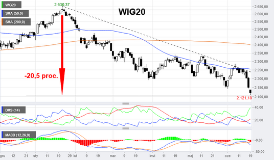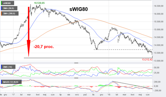 - Zgodnie z klasyką analizy technicznej przełamanie granicy bessy, liczonej jako 20-proc. spadek od ostatniego szczytu, uprawnia do posługiwania się słowem “bessa”. Takowy sygnał został właśnie wygenerowany przez dwa, mające potwierdzać się nawzajem w długim terminie, indeksy. Mowa jest o WIG20 oraz sWIG80, które ukazują tendencje panujące zarówno wśród największych graczy jak drobnych inwestorów – komentował sytuacją Piotr Neidek, analityk techniczny DM mBanku.