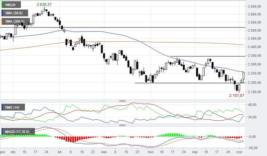 Pekao, PKN Orlen i KGHM były motorami napędowymi segmentu blue chips podczas wtorkowej sesji. Ich duże udziały w portfelu WIG20 oraz zwyżka cen akcji o ponad 3 proc. miały decydujący wpływ na to, że WIG20 zakończył ostatnią sesję wzrostem o 2,1 proc. do 2255 pkt. Warto odnotować, że indeks zakończył dzień na sesyjnym maksimum i rósł już trzeci dzień z rzędu. Sesyjne minimum z kolei wypadło na poziomie 2197 pkt. Dolny cień świecy niemal idealnie zatrzymał się na wsparciu 2200 pkt, dzięki czemu trwające odbicie wygląda całkiem optymistycznie. Trzeba jednak pamiętać, że ruch ten ma charakter korekcyjny. Dopóki WIG20 nie przebije oporu 2341 pkt (ostatni lokalny szczyt w trendzie spadkowym), dopóty obowiązywać będzie spadkowy scenariusz. Pozytywny wydźwięk ma też to, że WIG20 należał we wtorek do najmocniejszych indeksów Starego Kontynentu. DAX i CAC40 kończyły dzień zwyżkami, odpowiednio o 0,4 proc. i 0,1 proc., ale węgierski BUX i rosyjski RTS były wyraźnie pod kreską.