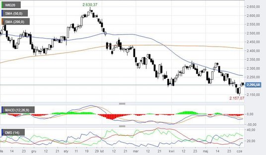 W USA w poniedziałek wpływ na zachowanie rynków mogły mieć przeniesione z weekendu informacje płynące z Chin. Minusem było to, że po rozmowach USA – Chiny, Chiny zapowiedziały, że wszelkie ustalenia zostaną anulowane, jeśli USA naprawdę nałożą cła na chińskie produkty. Plusem było to, że Chiny zapowiedziały obniżenie ceł na 1500 importowanych produktów. W USA opublikowany został raport o kwietniowych zamówieniach w przemyśle. Dowiedzieliśmy się, że zamówienia spadły o 0,8% m/m (oczekiwano spadku o 0,5%). Raport miał znikomy wpływ na zachowanie rynków, mimo że był bardzo słaby. Wall Street w poniedziałek kompletnie zlekceważyła zagrożenia związane z globalnym handlem zagranicznym. Najwyraźniej gracze zakładają, że wojna handlowa zakończy się na etapie potyczek. Wzrosty indeksów ciągle tłumaczono dobrymi danymi z rynku pracy, co jest bardzo śmiesznym tłumaczeniem, bo silny rynek pracy gwarantuje więcej podwyżek stóp, a to dla Wall Street korzystne nie będzie. Z rynkami się jednak nie dyskutuje, a na Wall Street zdecydowanie przeważa obóz byków. Co prawda zwyżki indeksów duże nie były - S&P 500 zyskał 0,45%, ale NASDAQ testował poziom szczytu wszech czasów i w cenach zamknięcia taki rekord ustanowił. Indeks S&P 500 nie przełamał oporu na poziomie 2.750 pkt., ale jeśli Donald Trump nie nabierze ochoty na kontynuację wojny handlowej to indeksy będą nadal rosły, a powiedzenie „w maju sprzedaj i uciekaj" tym razem się nie sprawdzi. GPW w poniedziałek rozpoczęła sesję od jednoprocentowego wzrostu WIG20. Jak pisałem w poniedziałek rano - rynek był na rozdrożu. Kontynuacja zwyżki, a najlepiej przełamanie poziomu 2.215 pkt., anulowałoby sygnał sprzedaży. Nic dziwnego, że indeks ustabilizował się w okolicach tego poziomu. Spadał jednak MWIG40. Po południu WIG20 zaczął rosnąć dalej mimo tego, że indeksy na innych giełdach osuwały się. Długo to nie trwało – indeks powoli ruszył na południe, ale szybko zawrócił odzwierciedlając zachowanie innych indeksów europejskich i kontraktów amerykańskich. Nic sensownego z tych robaczkowych ruchów nie wynikło. Końcówka sesji była nawet dość słaba, ale WIG20 ocalił zwyżkę o 0,91%. MWIG40 zakończył dzień spadkiem o 0,08%, czyli praktycznie neutralnie. Minusem było to, że obrót był relatywnie nieduży, a przede wszystkim to, że WIG20 nie wrócił nad opór na poziomie 2.215 pkt.