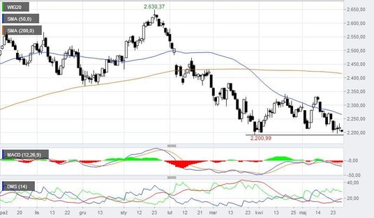 Pisząc o politycznej niepewności mam na myśli sytuacji we Włoszech i Hiszpanii. Na Półwyspie Apenińskim prezydent Włoch, Sergio Mattarella, nie zaakceptował kandydatury eurosceptyka na stanowisko ministra finansów rządu Liga – Ruch 5 Gwiazd i zapowiedział powołanie rządu technicznego, co zdaniem ekspertów będzie skutkować kolejnymi wyborami na jesieni. - Poza tym w piątek mamy głosowanie w Hiszpanii na temat wotum nieufności wobec rządu Rajoya, a po drodze mamy np. dane z Niemiec - jutro sprzedaż detaliczną i ceny importu – dodaje Tomasz Witczak, analityk FMCM. Taka atmosfera nie sprzyja rynkom akcji, co widać było po wtorkowym poranku. WIG20 po 30 min handlu spadał o 0,5 proc. do 2206 pkt, co oznacza, że jest o włos od technicznego wsparcia na 2200 pkt. Jest to dołek trwającej od stycznia tendencji spadkowej, więc jego przebicie będzie sygnałem do kontynuacji wyprzedaży. Można więc powiedzieć, że z punktu widzenia analizy technicznej dziś ważą się losy średnioterminowego układu sił w segmencie blue chips. Niestety w pozostałych segmentach też nie jest najlepiej. W ubiegłym tygodniu mWIG40 i sWIG80 wybiły nowe tegoroczne dna, co oznacza, że nadal pozostają pod kontrolą niedźwiedzi. Dziś rano pierwszy zyskiwał 0,3 proc., a drugi spadał o 0,2 proc. Jakby tego było słabe nastroje panowały dziś na innych europejskich parkietach. DAX i CAC40 traciły rano po blisko 0,6 proc.