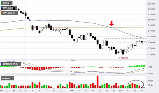 Indeks dużych spółek od wtorkowego poranka porusza się w wąskim, 19-pkt paśmie wahań. Kurs oscyluje przy okrągłym poziomie 2300 pkt. Patrząc na wykres z nieco szerszej perspektywy warto zauważyć, że trwający od początku kwietnia impuls korekcyjny zatrzymał się tuż poniżej ostatniego, lokalnego szczytu 2329 pkt. Jak widać byki, przynajmniej na razie, nie mają siły, by przerwać niekorzystną sekwencję. Co gorsza zwyżkom z ubiegłego tygodnia towarzyszyły coraz niższe obroty, co sugeruje, że paliwo do zwyżek się wyczerpuje. Dopóki 2329 pkt nie pęknie, dopóty obowiązuje scenariusz spadkowy.