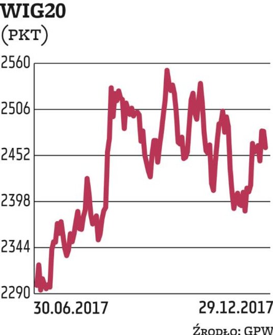 Już na samym początku sesji inicjatywę na rynku zdobyli sprzedający. W miarę upływu czasu ich przewaga była coraz bardziej wyraźna, przekreślając szansę na pozytywne zakończenie. Wyprzedaży papierów sprzyjały negatywne nastroje na wielu innych europejskich parkietach. Wyjątkiem były niektóre rynki wschodzące. W tych mało sprzyjających okolicznościach WIG20 zjechał prawie 0,8 proc. pod kreskę. Znacznie lepiej wyniki krajowych indeksów prezentują się w skali całego 2017 roku, który dla większości inwestorów okazał się dość udany. WIG zakończył rok ponad 23-proc. zwyżką, w czym duża zasługa największych spółek z WIG20. Indeks zyskał ponad 26 proc. Najmniej powodów do zadowolenia mają posiadacze akcji małych spółek, których notowania w drugiej połowie roku poddały się korekcie, zabierając znaczną część zysków. W rezultacie sWIG80 na koniec roku znalazł się tylko 2 proc. nad kreską. Prognozy analityków na kolejny roku są umiarkowanie optymistyczne. Zdecydowana większość obstawia zwyżki.
