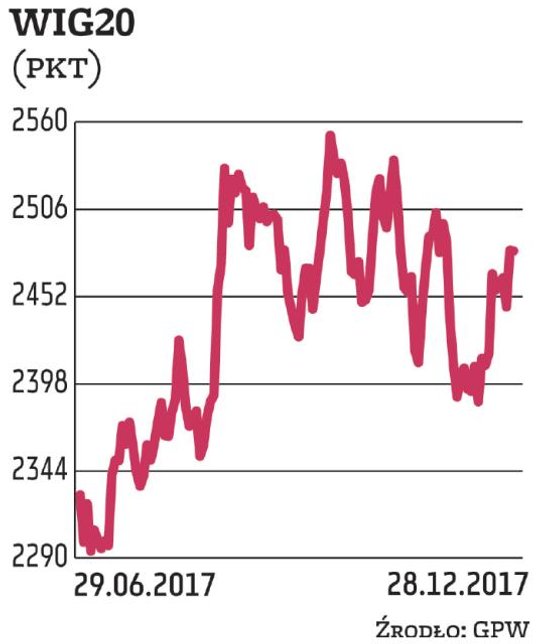 Ostatecznie WIG20 zakończył dzień symbolicznym spadkiem o 0,02 proc. i przed ostatnią sesją grudnia znalazł się na poziomie 2480,25 pkt. Najważniejsze jednak, że udało się utrzymać większość dorobku ze środy, kiedy to WIG20 wzrósł o 1,43 proc. Wówczas na wykresie powstała wysoka biała świeca z zamknięciem na najwyższym poziomie dnia, jednak nie udało się przebić ważnej strefy oporu, która zaczyna się w okolicach 2480 pkt. Podobnie w czwartek dla WIG20 był to sufit nie do przebicia. W efekcie na wykresie wyrysowała się świeca zwana szpulką z długim cieniem na dole i krótkim na górze. Dobrze obrazuje ona niezdecydowanie inwestorów co do kierunku, w którym ma zmierzać WIG20. Indeks blue chips znajduje się obecnie w bardzo ważnym miejscu, jednak w związku z niską aktywnością inwestorów w końcówce roku trudno się spodziewać, byśmy odpowiedź na to pytanie poznali w piątek, czyli podczas ostatniej sesji 2017 r. W czwartek liderem zwyżek w gronie blue chips był PZU, którego akcje pod koniec sesji zwyżkowały o około 3 proc. Największemu polskiemu ubezpieczycielowi udało się tym samym odwrócić złą passę i przerwać kilkutygodniowy spadek kursu. Za słabość WIG20 w dużej mierze odpowiada mocny spadek PKN Orlen, który ma największy wpływ na indeks. Inwestorzy najwyraźniej realizowali zyski po mocnym odbiciu notowań petrochemicznej spółki od okrągłego poziomu 100 zł. W czwartek akcje taniały o 3,19 proc. Przez większość dnia bardzo słabo wypadało Asseco Poland, które powróciło w okolice tegorocznych minimów. W końcówce sesji jednak inicjatywę przejęli kupujący. Rosnące zainteresowanie przecenionymi walorami Asseco widać także po skokowo wyższych obrotach.