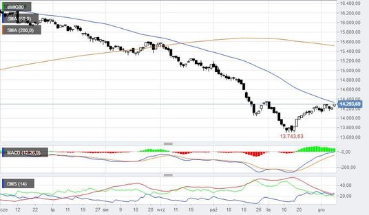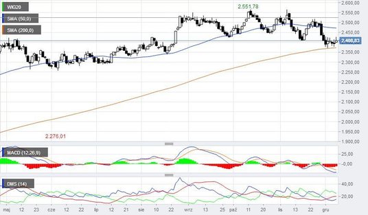Indeks WIG20 rozpoczął poniedziałkową sesję na poziomie 2415 pkt, a więc 0,3 proc. powyżej piątkowego zamknięcia. Notowania wciąż znajdują się blisko ruchomego wsparcia w postaci 200-sesyjnej średniej kroczącej (obecnie 2375 pkt). Jej przebicie będzie silnym sygnałem sprzedaży. Po raz ostatni WIG20 znajdował się poniżej 200-sesyjnej średniej rok temu. Plan dla byków na poniedziałek to oddalenie się od 200-sesyjnej średniej. Krótkoterminowy opór wyznacza z kolei 50-sesyjna średnia, która przebiega obecnie na poziomie 2475 pkt. Indeks blue chips zamknięty jest więc 100-pkt paśmie wahań, z którego wybicie nada kierunek krótkoterminowym zmianom.