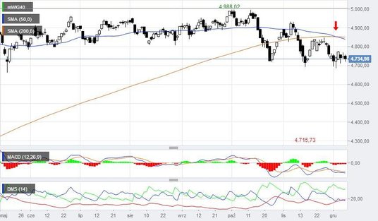 Dzisiejsza i najbliższe sesje będą też istotne dla układu kresek na wykresie mWIG40. Indeks znajduje się tuż nad istotną strefę wsparcia rozciągającą się między 4700 i 4660 pkt. Jej przebicie będzie sygnałem sprzedaży. Ryzyko zwiększa fakt, że w minionym tygodniu średnie kroczące z 50 i 200 sesji utworzyły formację krzyża śmierci.