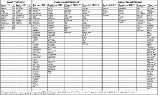 Długoterminowy złoty krzyż (skrzyżowanie średnich kroczących z 50 i 200 sesji) pojawił się na wykresach 6 spółek: CNT, Eurotelu, Leny, Mennicy Polskiej, Netii i PGS Software. Analogiczny krzyż śmierci widoczny jest na wykresach 10 spółek: Cyfrowego Polsatu, Eurocash, Famuru, Ferrum, Impery, INC, Invisty, KGL, MLP Group i Prairie Mining. Co najmniej roczne maksima notowań wyznaczyło 15 spółek, a roczne minima aż 49 spółek. Pełne listy firm z poszczególnymi sygnałami i statystykami znajdują się w tabeli.