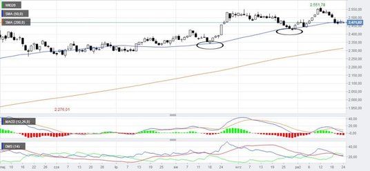 Nadziej na rychłe odbicie tli się jeszcze na wykresie WIG20. Indeks dużych spółek zatrzymał się bowiem przy 2470 pkt, gdzie znajduje się 50-sesyjna średnia krocząca. We września i sierpniu skutecznie spełniała ona swoją rolę ruchomego wsparcia.