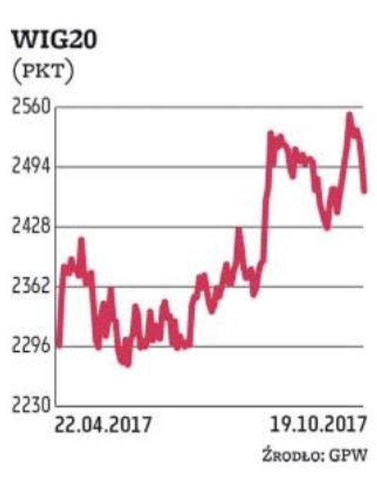 W czwartek indeksowi największych spółek najmocniej ciążyły notowania PKN Orlen, które przez cały dzień spadały o kilka procent. Inwestorów zawiodły wyniki paliwowego giganta wypracowane w III kwartale. Ostatecznie akcje spółki potaniały o 7,1 proc., do 120,8 zł. Warto zauważyć, że 11 października został ustanowiony szczyt wszech czasów w cenach zamknięcia na 134 zł. Pod koniec dnia o ponad 2 proc. taniały z kolei akcje Eurocashu, Grupy Lotos, LPP i KGHM. Największym wzięciem cieszyły się natomiast papiery mBanku, PKO BP i Tauronu.