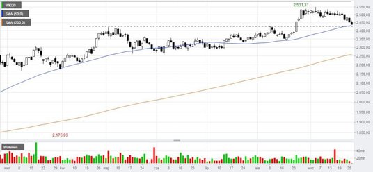 Na warszawskim parkiecie dominuje dziś kolor czerwony. 47 proc. spółek traciło o godzinie 13-stej na wartości, a główne indeksy były pod kreską. WIG20 spadł do 2441 pkt, a więc na razie realizowany jest scenariusz wybicia dołem z krótkoterminowej konsolidacji, w którym celem jest 2425 pkt. Słabo wygląda sWIG80, który wyznaczył nowy dołek trendu spadkowego 15 006 pkt. Na korzyść niedźwiedzi przemawiają też statystyki dotyczące rocznych ekstremów cenowych. Nowe minimum wyznaczyło już dziesięć spółek: CNT, Czerwona Torebka, EUCO, Fota, GPRE, Lentex, Polmed, Rafako, Sonel i Work Service. Na co najmniej rocznym szczycie znalazły się kursy akcji tylko trzech emitentów: Grupy Azoty, Netmediów i Pragmy Inkaso. Pocieszające może być to, że dzisiejszym spadkom towarzyszą niewielkie obroty. Na półmetku sesji wynosiły one niecałe 300 mln zł.