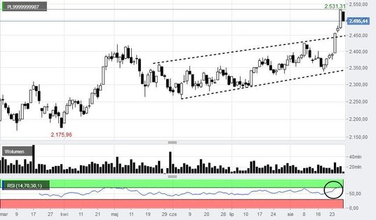 W porannym komentarzu zwracaliśmy uwagę, że WIG20 wszedł w strefę wykupienia, co sygnalizował oscylator RSI przekraczający 70 pkt. Ponadto indeks ma za sobą siedem wzrostowych sesji z rzędu, podczas których jego notowania skoczyły o 7,7 proc. i wyznaczyły nowy szczyt hossy 2534 pkt. Tak wysokiego tempa byki nie są w stanie utrzymać przez dłuższy czas, dlatego wtorek przyniósł schłodzenie nastrojów. Na półmetku sesji WIG20 spadał o 1,3 proc. do 2498 pkt, WIG o 1,1 proc. do 64 442 pkt, mWIG40 o 1,1 proc. do 4834 pkt, a sWIG80 o 0,8 proc. do 15 419 pkt. Wartość obrotów sięgała z kolei 420 mln zł, co pokazuje, że realizacja zysków nie odbywa się przy ponad przeciętnej aktywności inwestorów. Mamy raczej do czynienia z naturalną korektą. WIG20 na razie broni pułapu 2500 pkt, co także stanowi pozytywny sygnał.