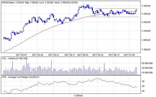Po silnej, środowej zwyżce notowań WIG20, czwartek przyniósł stonowanie nastrojów. Sesja zaczęła się od spadku indeksu blue chips o 0,2 proc., co pokazało, że część inwestorów zrealizowała zyski z poprzedniego dnia. Apetyty na sprzedaż nie były jednak zbyt duże, o czym świadczy płytkie, dzienne minimum na poziomie 2333 pkt. Przez większość sesji kurs konsolidował się przy poziomie środowego zamknięcia (2341 pkt), by w końcowej fazie sesji lekko przemieścić się na północ. Ostatecznie WIG20 wzrósł w czwartek o 0,4 proc. do 2350 pkt. Zmiana to wprawdzie niewielka, ale każde kilka punktów, które przybliża nas do wybicia granicy konsolidacji 2360 pkt, należy interpretować optymistycznie. Zwłaszcza, że indeks utrzymał się nad linią oporu poprowadzoną po szczytach z maja i czerwca i nad linią 50-sesyjnej średniej kroczącej. Realne w krótkim terminie pozostaje więc dojście do szczytu hossy przy 2422 pkt. Wsparciem technicznym dla notowań pozostaje natomiast bariera 2300 pkt.