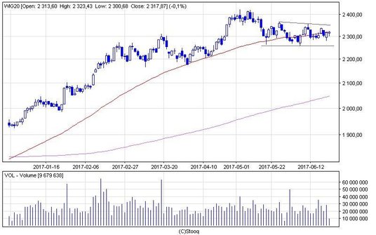 Od miesiąca WIG20 konsoliduje się przy 2300 pkt. Byki wyraźnie nie chcą dopuścić do silniejszego przełamanie tej bariery, ale nie mają też na tyle paliwa, by ruszyć na północ i kontynuować hossę. Ten schemat powtarza się także podczas dzisiejszej sesji. Rano powiało grozą, bo indeks spadał w porywach do 2300 pkt, ale w ciągu kilku godzin podskoczył do 2323 pkt. Źródeł poprawy nastroju na próżno szukać w kalendarium makroekonomicznym. To raczej zwyżki na zachodnich parkietach – DAX też wyszedł na zero, podobnie jak kontrakty terminowe na S&P500. Dzisiejszej sesji towarzyszą małe obroty. Na półmetku handlu wynosiły zaledwie 330 mln zł, z czego prawie połowę generowały trzy spółki: PKN Orlen, PZU i Pekao.