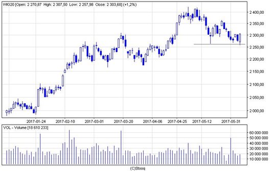 Nikt chyba by się nie obraził, gdyby z przebiegu wtorkowej sesji wyciąć fragment między 10.30 i 15.30. W tym czasie bowiem WIG20 poruszał się horyzontalnie, w bardzo wąskim paśmie wahań, tuż nad 2280 pkt. Podczas całej sesji pojawiły się tylko dwa impulsy wzrostowe. Ten w pierwszej godzinie handlu, zainicjowany przez naruszenie majowego dołka korekty 2263 pkt oraz ten w końcówce sesji, gdy indeks pchnęły w górę PKO BP, PKN Orlen oraz Lotos. Dwa zrywy kupujących wystarczyły, by WIG20 zakończył wtorkową sesję wzrostem o 1,2 proc. do 2303 pkt. Z technicznego punktu widzenia warto zwrócić uwagę na dwa aspekty: po pierwsze udało się wybronić majowy dołek, po drugie notowania wróciły nad barierę 2300 pkt. I to wszystko w kiepskim otoczeniu zagranicznym. Gdy WIG20 wybijał sesyjne szczyt DAX i CAC40 traciły odpowiednio 1 proc. i 0,8 proc. Ponadto kalendarium wtorkowe było ubogie w istotne odczyty, więc i tu na próżno szukać było argumentów do wzrostu. Nasz rynek pokazał w we wtorek byczy charakter, co dobrze wróży na najbliższą przyszłość. Trzeba jednak pamiętać, że wiele zależeć będzie od wtorkowych wydarzeń: posiedzenia Europejskiego Banku Centralnego, przesłuchania byłego szefa FBI Comeya oraz przedterminowych wyborów w Wielkiej Brytanii.
