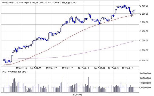 WIG20 wypada na tym tle słabo, bowiem spadał na półmetku sesji o 0,3 proc., ale trzeba zauważyć, że indeks wyszedł z porannego dołka zanotowanego na poziomie 2316 pkt. Dopóki wskaźniki utrzymują się powyżej krótkoterminowych poziomów wsparcia, dopóty pozycja byków na GPW pozostaje niezagrożona.
