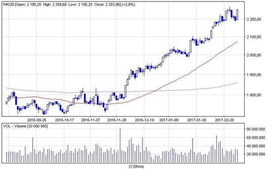 Od mocnego, wzrostowego akcentu rozpoczął się marzec na warszawskim rynku akcji. W środę WIG20 wzrósł o 2,9 proc. do 2253 pkt i odrobił lwią część strat spowodowanych trzydniową korektą. Nowy szczyt hossy wyznaczył sWIG80, który po raz pierwszy od 9 lat znalazł się powyżej 16 000 pkt. Wskaźnikowi mWIG40 do rekordu zabrakło zaledwie 4 pkt. Zwyżkującym indeksom towarzyszyły wysokie obroty, które jeszcze przed fixingiem przekroczyły wartość 1 mld zł. Motorami napędowymi sesji były sektory: bankowy, odzieżowy, farmaceutyczny, górniczy i paliwowy. Indeksy reprezentujące te branże zyskiwały po południu po ponad 2 proc.
