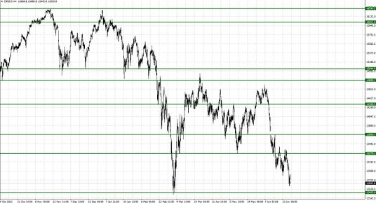 Pierwsza część sesji w USA była pomyślna dla obozu byków. Wydawało się, że kupujący przystąpili z większą chęcią do akcji, ale nie trwało to długo. Sesja zakończyła się na poziomach wyraźnie oddalonych od maksimum dnia. Podczas notowań w strefie azjatyckiej nie było widać poprawy. Obecnie ceny kontraktów na główne indeksy w USA i indeksy europejskie ponownie znajdują się przy wczorajszych minimach. Wyznaczenie nowych będzie odebrane jako sygnał potwierdzający słuszności po stronie niedźwiedzi.