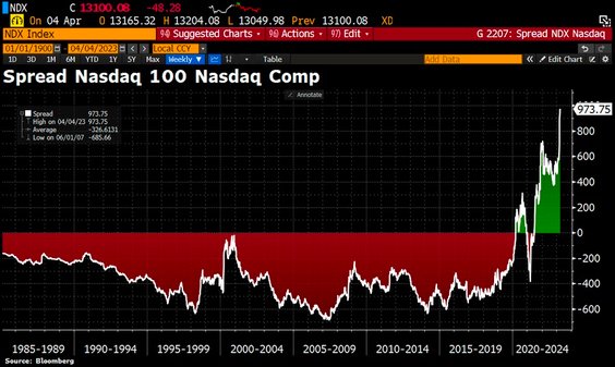 Przesunięcie punktu ciężkości z inflacji na recesję ma miejsce, gdy rynek ma do czynienia z pewnymi ogromnymi dysproporcjami. Spread między Nasdaq 100 (QQQ) a 3000 akcji w Nasdaq Composite jest najszerszy w historii,