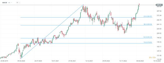 Akcje Microsoftu (MSFT.US) wymazały wszystkie spadki z 2022 roku i testują nowe, historyczne szczyty dzięki euforii AI oraz udziałem w biznesie OpenAI.
