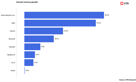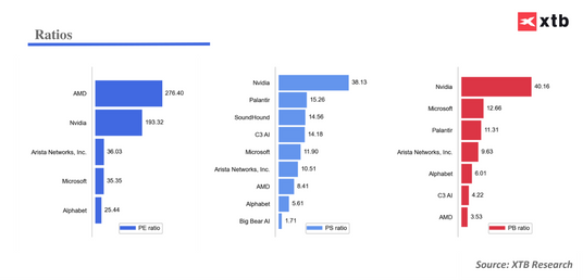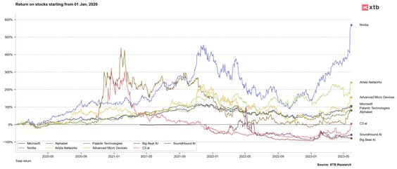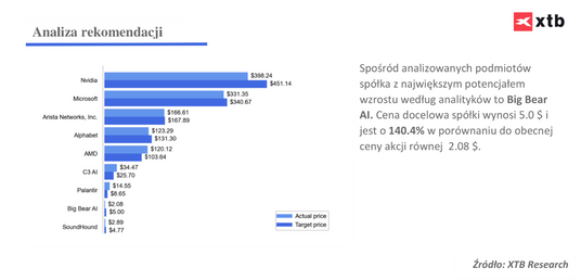 Euforia związana z AI sprawia, że analitycy podnieśli w ostatnim czasie rekomendacje dla wielu spółek korzystających z tego trendu. Mimo potężnej premii w relacji do wyceny fundamentalnej, Wall Street widzi wciąż spory potencjał dla Nvidia. Rekordową premię od bieżącej wyceny spółki wskazał fundusz Oppenheimer - podniósł cenę docelową dla Big Bear AI (BBAI.US) z 10 USD do 15 USD za akcję. Akcje spółki kosztują obecnie 2 USD. Warto wskazać jednak, że żadna rekomendacja nie jest jednoznaczna z faktycznym osiągnięciem prognozowanego pułapu cenowego.