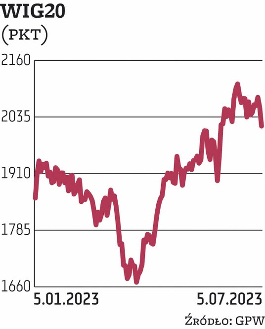 W środę od rana kupujący mieli pod górkę. Poprzednia sesja przy Wall Street nie była zła dla inwestorów, ale już słabe dane z Chin podkopały nastroje w Azji. Indeksy europejskie poszły śladem tamtejszych rynków i rozpoczęły dzień ze spadkami. Krajowy WIG20 pierwszą godzinę sesji kończył ze spadkiem o 0,8 proc. przy bardzo niskich obrotach. Zachowanie indeksu krajowych blue chips nie różniło się wiele od głównych europejskich benchmarków, aczkolwiek zauważalna była słabość GPW. Kolejne godziny środowej sesji coraz bardziej oddalały WIG20 od europejskiej średniej. Tuż po południu indeks dużych spółek spadł poniżej lokalnych dołków z drugiej części czerwca. Dla sprzedających było to jednak wciąż mało. Podaż kontynuowała atak, spychając WIG20 na koniec dnia aż 2 proc. pod kreskę. W rezultacie zakończył on dzień na poziomie 2015 pkt, a więc najniżej od równo miesiąca. Na koniec dnia wśród blue chips najsłabiej prezentował się CD Projekt ze spadkiem o 5,5 proc. Do tego aż trzy firmy finiszowały z ponad 3-proc. zniżką. Na zielono dzień zakończyły tylko Orange i Kęty, ale ich umocnienie było skromne. Do obniżki WIG20 w dużej mierze przyczyniły się banki, a indeks skupiający te firmy tracił na koniec dnia 1,88 proc. Zniżkom dużych spółek towarzyszyła przecena złotego do dolara i euro.