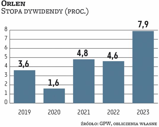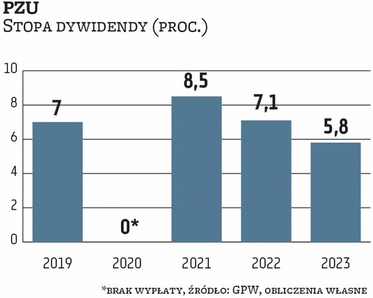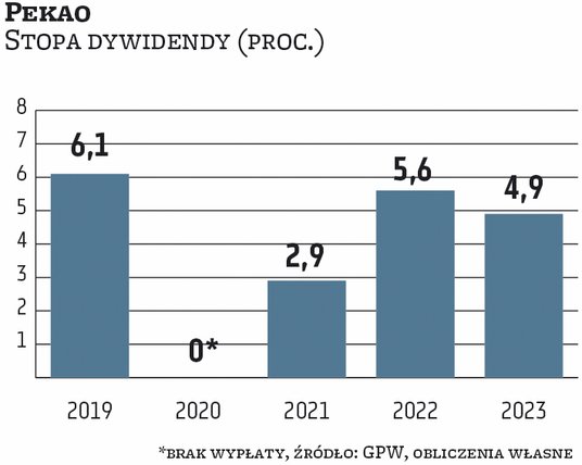 Z szacunków biur maklerskich wynika, że nominalnie największa dywidenda, która może nawet sięgnąć blisko 5 mld zł, spodziewana jest w PKO BP (przy przeznaczeniu na wypłatę 75 proc. zysku). Warto zauważyć, że w grudniu bank zdecydował o wypłacie 1,6 mld zł zaliczki na poczet dywidendy za 2023 rok, co daje 1,28 zł brutto na akcję. Przy obecnym kursie daje to stopę na poziomie 2,5 proc. Dniem prawa do dywidendy jest 25 stycznia br.