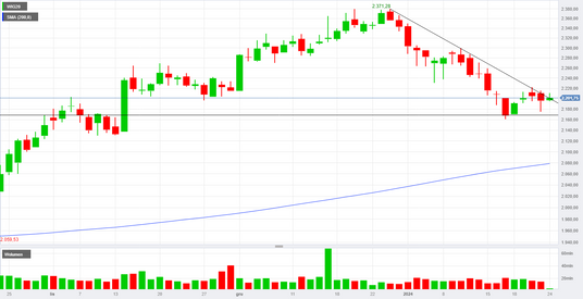 Środowa sesja jak na razie układa się pod dyktando kupujących. Popyt czyni coraz większe starania o zmianę atmosfery na GPW. Przypomnijmy, że WIG20 po osiągnięciu lokalnego szczytu pod koniec grudnia tkwi w korekcie ubiegłorocznych zwyżek. W poprzednim tygodniu indeks dużych spółek zszedł nawet poniżej szczytu z przełomu lipca i sierpnia 2023 r., a dorobek sprzedających urósł do 7,5 proc. w tym roku. Poziom ten jednak aktywował kupujących, choć nie możemy jeszcze mówić o zmianę trendu w krótkim terminie. Krajowi inwestorzy mają jednak spore wsparcie w giełdach zagranicznych, szczególnie tej najważniejszej. Amerykańskie indeksy znów wzbiły się na nowe rekordy, co powinno być bodźcem także dla GPW. Jeśli dzisiejsza sesja zakończyłaby się wyraźną przewagą popytu, WIG20 w cenach zamknięcia opuściłby formację trójkąta, którą wyrysował w ostatnich tygodniach. Oznaczałoby to wyjście ponad linii krótkoterminowego trendu spadkowego i zapewne impuls do zwyżek. Indeks dużych spółek wsparty jest też mocniejszym złotym.