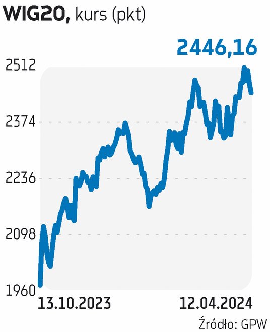 W piątek nastroje na rynkach pogorszyły się w związku z obawami o eskalację wojny na Bliskim Wschodzie i ten czynnik będzie zapewne kluczowy dla zachowania się rynków w poniedziałek. Inwestorzy jeszcze dość niechętnie pozbywają się akcji, ale złoto wzbijało się na nowe rekordy, rosła też cena ropy naftowej. Przez większą część dnia w Europie indeksy świeciły na zielono. WIG20 także zyskiwał, choć skromniej od niemieckiego DAX czy francuskiego CAC40. Na starcie popyt jeszcze raz podjął walkę o 2500 pkt, ale sił ponownie zabrakło. Przypomnijmy, że w pierwszej połowie minionego tygodnia indeks dużych spółek wspiął się nawet do 2529 pkt i jest to nowy rekord hossy. Niestety, tylko dwukrotnie WIG20 zamknął się powyżej okrągłego poziomu, a punktem odniesienia do poniedziałkowej sesji – piątkowej 0,9-proc. przecenie – będzie 2446 pkt. Oznacza to, że indeks krajowych blue chips zszedł poniżej najwyższego poziomu z lutego, czyli poprzedniego szczytu hossy, co teoretycznie nie wróży dobrze przyszłości trendu wzrostowego. Pamiętamy jednak, że w tym roku już nieraz indeks łamał książkowe prawidła analizy technicznej, a kluczowe będzie zachowanie głównych rynków i rozwój sytuacji na Bliskim Wschodzie.