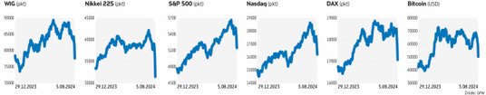 Poniedziałkowe wydarzenia rynkowe można zaliczyć do kategorii tych, które na długo zapadną w pamięć inwestorów. Zaczęło się od paniki na rynkach azjatyckich. Nikkei 225 stracił w poniedziałek ponad 12 proc. Po Azji przyszła pora na Europę. Tutaj również byliśmy świadkami bardzo mocnych spadków. WIG20 w ciągu dnia tracił na wartości nawet ponad 5 proc., niemiecki DAX spadał ponad 3 proc. Później swoje dołożyli również Amerykanie. Indeksy na Wall Street zaczęły dzień również od bardzo mocnego cofnięcia. Dość powiedzieć, że już w pierwszych minutach handlu S&P 500 tracił na wartości ponad 4 proc., a technologiczny Nasdaq 5,5 proc. Odpływ kapitału widać było również na rynku krypotwalut. Bitcoin w ciągu dnia tracił nawet 15 proc., zbliżając się tym samym do poziomu 50 tys. USD. Kapitał znów szuka bezpieczeństwa (w poniedziałek kierował się on m.in. w stronę franka, jena czy też amerykańskich obligacji skarbowych), bo boi się recesji w Stanach Zjednoczonych. Tę mają zwiastować m.in. dane z amerykańskiego rynku pracy, które ukazały się w piątkowe popołudnie. – Słabsze dane z gospodarki amerykańskiej przesunęły oczekiwania inwestorów w stronę obaw przed recesją. Ponadto bardzo dynamiczny spadek rentowności amerykańskich obligacji, w tym głównie na krótkim końcu krzywej, powoduje, że inwersja krzywej rentowności jest negowana, co historycznie było silnym sygnałem uprawdopodobniającym recesję – wskazuje Sobiesław Kozłowski z Noble Securities.