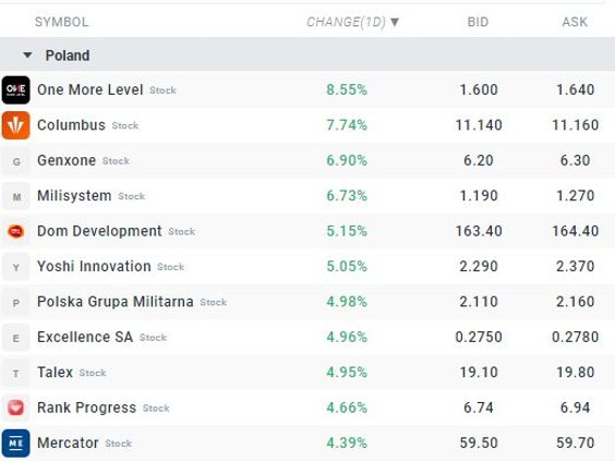 W czwartek GPW nabiera optymizmu, którego na próżno było szukać na początku tygodnia. W ujęciu intraday indeks blue chipów zyskuje 0,81%, mWIG40 rośnie o 0,49%, zaś sWIG80 kontynuuje sesję na płasko. WIG20 przestaje być tym samym czarnym ostatnich sesji i dołącza do reszty europejskich indeksów na zielono: włoski FTSE MIB zyskuje 0,81%, francuski CAC40 +0,74%, niemiecki DAX +0,67% i hiszpański IBX35 +0,27%.